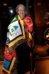 | This quilt was created by the students and features their hand painted self portraits, class photo and the school mascot. |