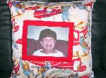 | Custom Photo Pillows All sizes, many theme fabrics, embroidered with your special message. Prices start at $50.00 (as shown 14" x 14") |